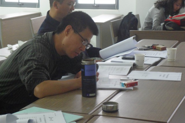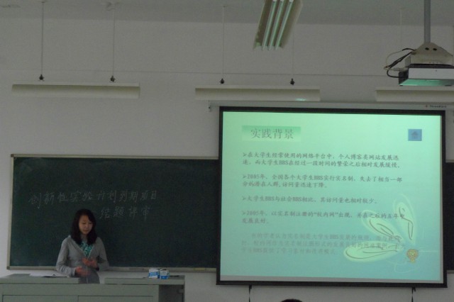 在主持人介绍嘉宾和活动主题后,07级的吕雯倩同学率先走上讲台开始汇报。她们团队研究的课题是《大学生BBS现状调查及发展前景研究》,吕同学条理清晰地介绍了他们团队实践的背景、调查方式以及成果。陈霖老师对他们的课题研究给予了高度评价,认为这个课题对提升在校大学生的能力有很大的帮助,同时也对其中一些小的细节问题提出了意见。