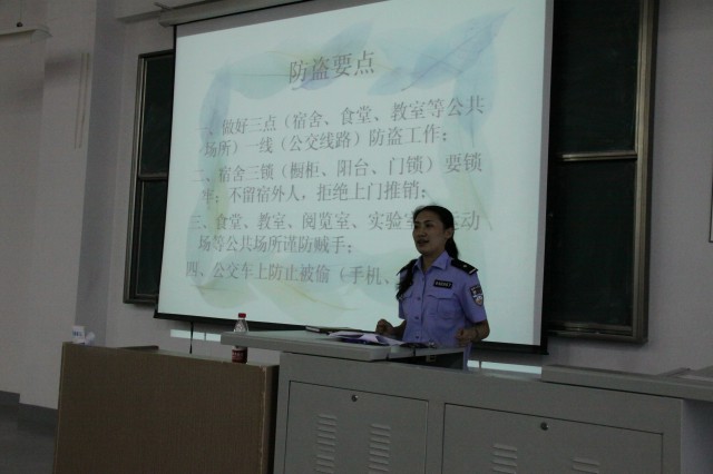 贾警官分别从防火、防盗、防抢、防骗、防交通事故和防性骚扰这六个方面讲述了大学生活中应当注意的安全问题。特别是防盗和防骗的问题,贾警官列举了大量生动的案例,让大家在真实而轻松的氛围中了解到犯案人员的常见手法,也进一步体会到了防盗防骗的重要性。在讲防盗要点中,贾警官郑重提醒同学们一定要记得关宿舍门,不要留宿外人,拒绝上门推销等。她还重点给大家介绍了近年来校园案件的特点:第一是宿舍多发性,第二是内盗的发生,第三是熟人犯案。“当然,这并不是让我们怀疑身边的同学,”正如贾警官所说,“在大学生活中,害人之心不可有,防人之心不可无。”