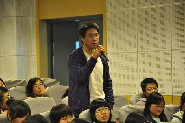 听完两位老师的解读,同学们都按捺不住,纷纷举手表达自己的感想,其中不乏尖锐而深刻的问题。第一位同学站起来就向陈霖老师请教影片如何平衡主旋律要求和艺术性的问题。陈老师认为他自己在创作过程中,尽力保持影片积极向上的主旋律风格,在此之外才提出一些精神上的反思,如人类为城市过快发展是否会付出一些代价等等。曾一果老师对这个问题作了补充,他认为影片存在主流话语之外的对城市的探讨,如片中表现苏州的部分,就暗示了对城市慢节奏生活的追求。