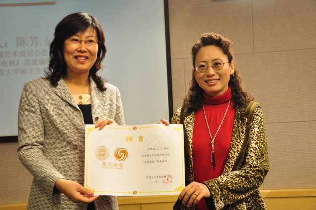 讲座开始前,凤凰传媒学院党委书记赵阳老师向陈芳女士颁发了“凤凰讲坛”特邀嘉宾聘书并合影留念。在热烈的掌声中,陈芳女士走上讲台,她从“军事题材电视剧”入手,剖析了“主旋律题材电视剧历史演进及其艺术特征”,为在座的师生带来了一场盛宴。她的演讲分四部分: