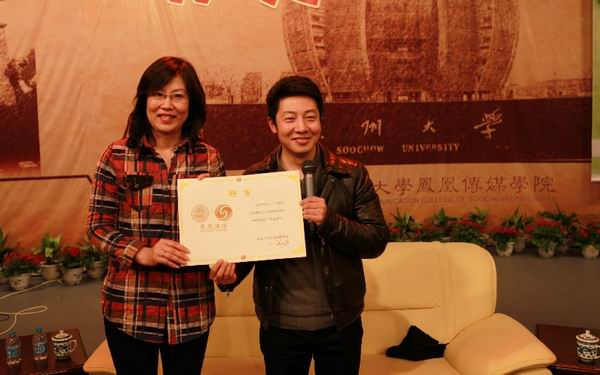 活动结束之际,撒贝宁奉献了一曲韩磊的《等待》。曲毕,凤凰传媒学院党委书记赵阳亲自为撒贝宁颁发了凤凰讲坛特邀嘉宾的聘书。