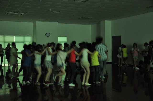每个到场的同学手里拿着代表身份的扑克牌,戴着从墙上摘下来的假面,对于即将开始的舞会充满期待。终于,主持人以一首热情激扬的《王妃》独唱热腾了现场,随后,一首动听的女声独唱《画中仙》把大家渐渐带入了舞动的状态。为了让大家有一个前期的准备,工作人员先放了一首耳熟能详的《兔子舞》,在熟悉的音乐中,在于乐和陈希萌两位领舞的带领下,现场同学开始不由自主地加入到兔子舞的行列中,原先散在四周的同学,此时此刻已经成了一条长长的队伍,随着音乐一起舞动。一曲兔子舞过后,一首又一首劲爆的动感舞曲点爆了现场,在领舞的带领下,大家渐渐脱去刚开始时的羞涩,跟随着领舞的舞步,在音乐中翩翩起舞。由于很多人是第一次尝试跳这类集体舞,开始时很多人都无法跟上音乐的节拍。于是,作为领舞的陈希萌就先让音乐停下来,一步一步地现场教大家怎么跳。明白舞步中的规律后,大家的热情更加高涨,跳舞的队伍也越来越壮大。