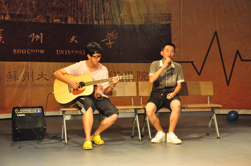 除了短剧和小品,晚会当然少不了歌曲节目。未命名成员王歆蔚同学带来了两首五月天的劲爆歌曲,还有未命名社团元老级人物的款款演唱。11级新生杨春阳和杨磊则代表社联献上了一曲《我俩》。
