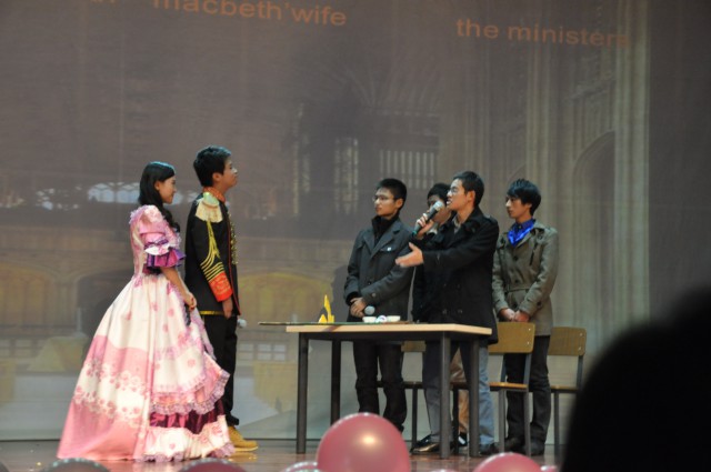 前期准备从九月初开始,由院科协活动部商讨确定剧本并改编剧本。10月19日,我院英语短剧大赛初赛一结束,这支队伍就进入了紧张的备战阶段。10月25日晚正式开始排练,一直到决赛前夜,大家坚持每晚六点到五食堂三楼排练。在将近一个月的筹备过程中,队员们克服了运动会、hold麦等活动的时间冲突,有的演出和演员家人的生日时间冲突了,可是该同学仍然留在台上,和大家一起为共同的目标努力。演出中的每一个动作,每一句台词,都经过了大家的精雕细琢、反复修改。使者和麦克白夫人跪倒的戏排了一遍又一遍,演员的膝盖都磕青了,仍毫无怨言。一个多月的排练,大家从人都到不齐,到后来慢慢入戏,尤其在半决赛一鸣惊人之后,更是斗志昂扬。反串女巫一角的施宏宇同学说:“我知道这样的表演一定可以得到好评。因为它不是一味的讲究苦情,不是一味的追求主旋律,不是一味的搞笑。我们苛刻地对待每一个细节。费了多少心血只有自己知道,多累多苦只有自己知道,多少犹豫矛盾也只有自己知道。”