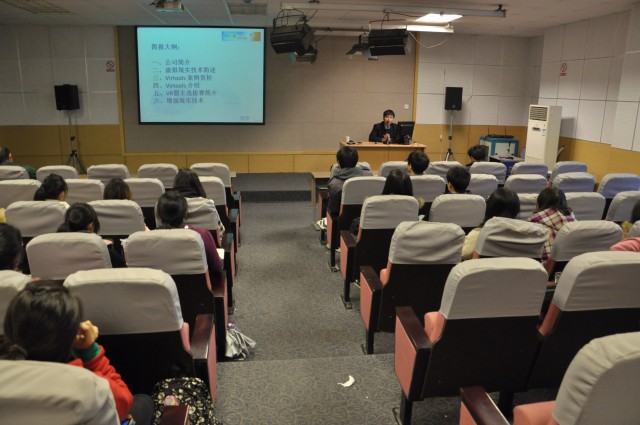 讲座最精彩的部分在于李先生通过播放视频,向大家展示了虚拟现实技术在生产生活中的广泛用途。他展示了台湾艺术学院同学制作的“镜花水月”,“花、月”是由特殊的光投映在一个白色的空盘子上形成的,神奇之处在于你可以用一个看似普通的勺子捞起“水中”的月亮和荷花,当大家还在为这一幕瞠目结舌时,李先生解释道:“其实原理很简单,因为勺子的手柄处安装了特殊的光传感器。”大家这才豁然开朗。虚拟现实的技术还广泛应用于房屋建设、汽车设计、军事演练、工业生产以及如国庆阅兵、奥运会开幕式等大型活动的排练中。通过这一技术,人们可以在电脑前欣赏一幢尚未建成的别墅,可以在家参观世博馆,还可以在室内体验驾驶新型汽车的感觉。李先生还耐心地把这些虚拟现实作品的制作过程给同学们讲解了一遍,拉近了这一新型技术与同学的距离。