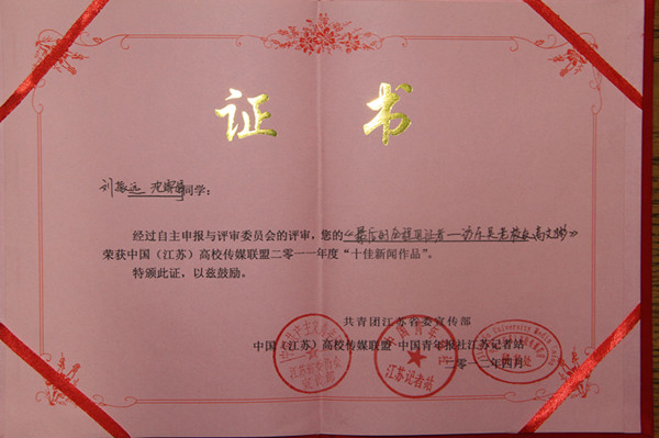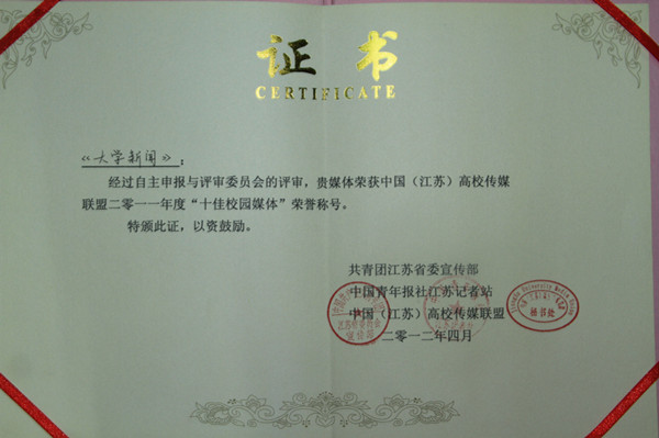 近日,我院《大学新闻》社在“2012中国(江苏)高校传媒联盟年会”上荣获“十佳校园媒体”的光荣称号,汪可、王舒娅、冯晓晓、刘钦瑶、李向南的《如何面对夭折的青春》及刘振远、沈雪婷的《最后的全程见证者——访东吴老校友高文彬》两篇报道荣获“十佳新闻作品奖”,主编刘振远斩获“最佳运营奖”。更令全社成员欣喜的是,该校园媒体官方网站将于5月4日正式上线。 中国高校传媒联盟是在共青团中央、教育部指导下,中国青年报社联合63所重点高校发起成立的高校传媒间的联谊组织,其宗旨在于为各高校的校园媒体搭建一个交流、共享、提高、互惠的合作平台。江苏高校传媒联盟于2008年11月8日成立,在共青团江苏省委、中国青年报江苏记者站的指导下开展活动,秘书处设在中国青年报江苏记者站。近年来,江苏高校媒体在各高校党委宣传部、团委等部门的指导下得到了蓬勃发展,为加强高校宣传工作、促进校园文化建设、构建和谐校园做出了卓越贡献。 《大学新闻》创刊于1998年4月,是我院学生在学院的支持下,完全自主编辑出版的一份学生报纸,以“为学生立言”为办报理念,以“打造大学生主流媒体”为目标,不断发展,不断完善,目前是我校唯一一家全国四星级校园媒体,同时也是江苏省唯一一家全国四星级报纸类校园媒体,全国仅有11家校园媒体获此殊荣。 《大学新闻》社成员与中国校媒联盟以及国内各地大高校保持了长期的交流互动关系。目前全社共有4位同学是江苏高校传媒联盟成员,先后参与了苏北大学生村官调研、上海校媒主编培训会、“常春藤”学生领袖对话中国高校传媒联盟、江苏高校传媒联盟招新宣讲会、“微社团”活动等多项活动。此次我院学生媒体《大学新闻》在2012中国(江苏)高校传媒联盟年会上所取得的这些成绩,对我校学生媒体的发展具有良好的鼓励和推动作用,对大学生独立思考、展现年轻一代的精神风貌起到积极的导向作用。