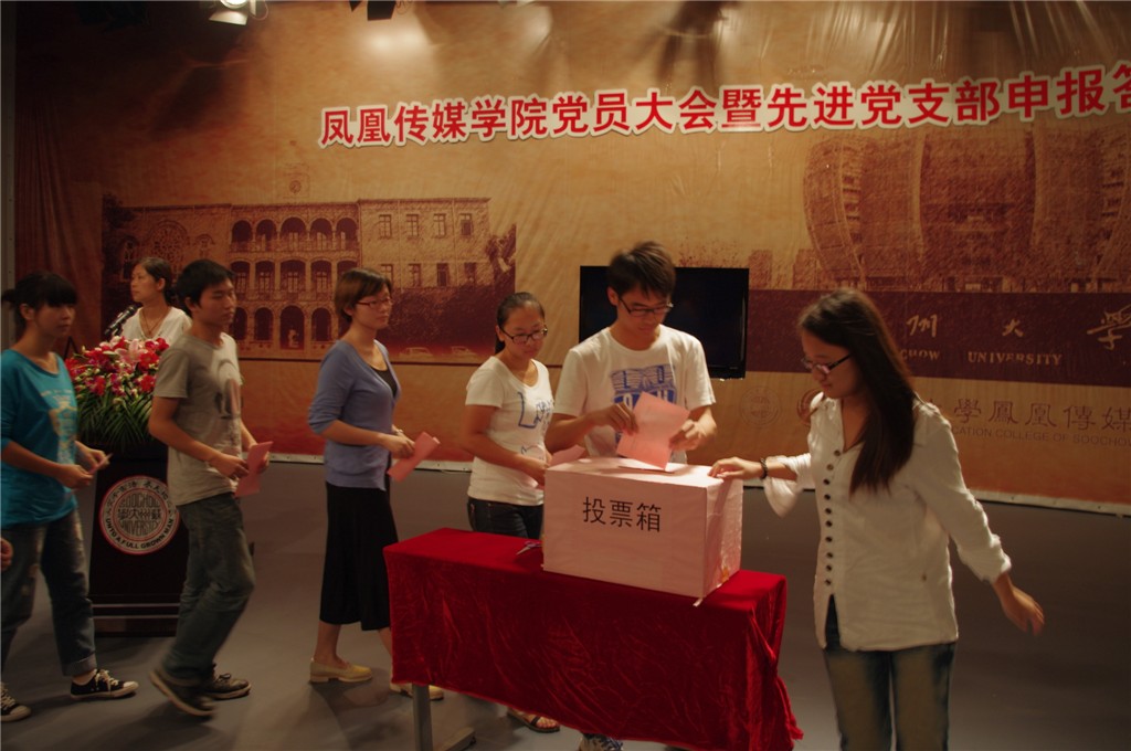 在校第十一次党代会到来之际,我院全体党员于9月5日下午在1005演播厅召开了凤凰传媒学院党员大会暨先进党支部申报答辩会。本次党员大会选举产生了我院校第十一次党代会代表三名,并顺利完成了2012——2013学年先进党支部的申报答辩工作。