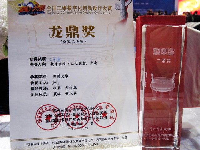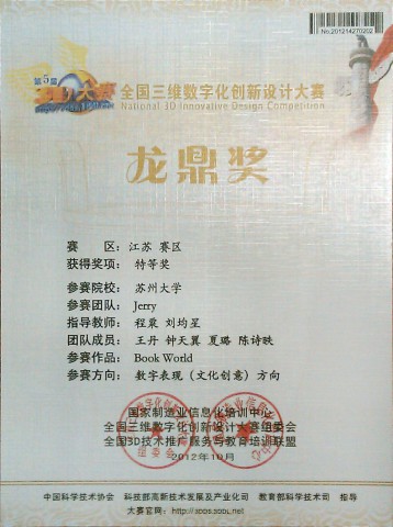 2012年11月30日至12月2日,由夏璐、钟天翼同学为团队代表参加在常州举办的全国现场总决赛。在三天的激烈角逐中,JELLY团队的动画作品《BOOK TOWN》斩获数字文化创意表现类全国龙鼎奖二等奖。