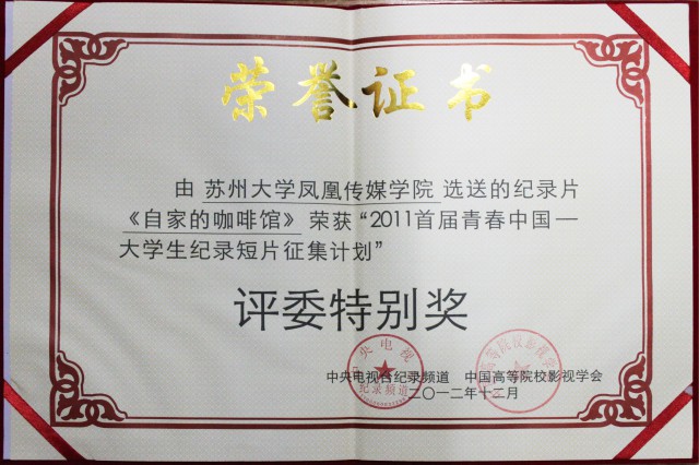 近日,从北京传来喜讯,在刚刚落幕的首届“青春中国——大学生纪录短片征集计划”颁奖典礼上,我校传媒学子拍摄的纪录片《自家的咖啡馆》获得最具份量的评委特别奖。