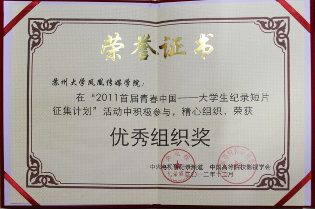 今年以来,传媒学子在各级、各类专业竞赛中屡获佳绩:在江苏省第二届“阳光校园”DV大赛中,我校的获奖总数和层次均位居全省参赛高校前列,其中纪录片类作品获特等奖1项,一等奖1项,二等奖2项,三等奖2项,占全部获奖总数的五分之一;剧情片类作品获一等奖2项,二等奖1项,三等奖5项,占全部获奖总数的七分之一。在“领航杯”•2012年江苏省大学生数字媒体作品竞赛中,我校传媒学子报送的DV作品共获奖4项,其中一等奖1项,二等奖1项,三等奖2项。在苏州市“影像苏州”比赛中,我校传媒学子获二等奖1项,三等奖1项、单项奖1项(最佳摄像)、优秀奖2项,占全部获奖作品总数的五分之一强。正是由于取得了上述不俗成绩,我校荣获江苏省第二届“阳光校园”优秀DV作品大赛优秀组织奖,凤凰传媒学院荣获首届“青春中国——大学生纪录片征集计划”优秀组织奖,杜志红、王玉明、于莉莉三位老师获得优秀指导教师。