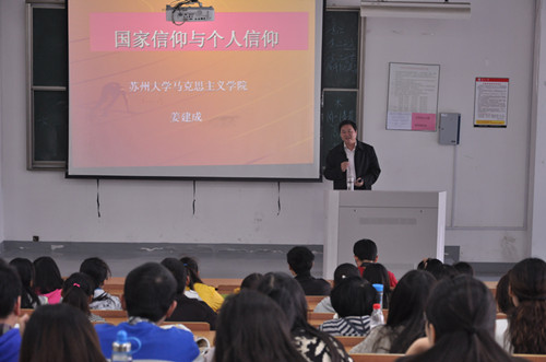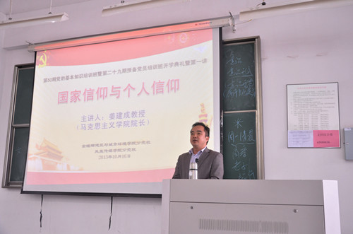 随后,马克思主义学院院长姜建成教授带来了题为“国家信仰与个人信仰”的讲座。姜院长从“国家信仰与个人信仰问题的提出及研究意义、国家信仰与个人信仰问题的主旨要义和基本特征、如何在实践中坚持国家信仰与个人信仰的统一”三个方面阐述了国家信仰与个人信仰的深刻联系,在阐述过程中旁征博引,引用了大量丰富生动的事例,将“信仰”的话题娓娓道来。并引用了习近平总书记“自己的事情自己做、别人的事情帮着做、公益的事情抢着做”的论断,希望广大大学生党员能够坚守共产主义信仰,守住做人、处事、用权、交友的底线,从而实现个人利益与国家利益的统一。