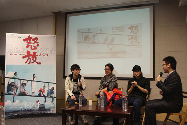 “一生中至少有两次奋不顾身,一次为梦想,一次为爱情。”11月21日下午4点,在充斥着激烈摇滚乐的预告片中,电影《怒放2013》主创团队导演卢庚戌、主演潘粤明、王啸坤在同学们的期盼与欢呼中走进凤凰传媒学院1005幢5339教室,一场关于梦想与爱情的交流活动在这里拉开序幕。