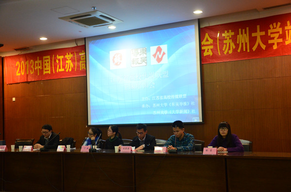 12月15日,中国(江苏)高校传媒联盟2013主编培训会在苏州大学本部王健法学院东吴大讲堂如期举行。本次活动由中国(江苏)高校传媒联盟主办,苏州大学《大学新闻》社和《东吴导报》社联合承办。河海大学、江苏大学、江苏科技大学、南京农业大学、盐城工学院等各大高校的媒体负责人相互交流学习,此外还邀请了江苏联合文化传媒有限公司总监吴嘉昊,《东方早报》总编辑助理、要闻部主任夏正玉为大家带来精彩的演讲。