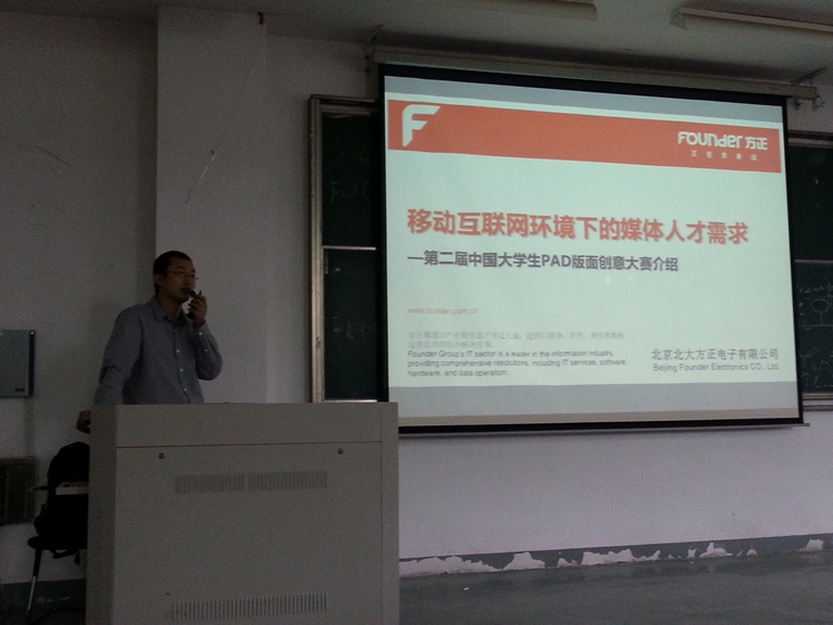 5月12日下午,第二届中国大学生“方正飞翔奖”PAD版面创意大赛宣讲会在文综楼1001幢1101室举行,北京北大方正电子有限公司副总经理张林、数字出版与教育事业部产品经理张晨与凤凰传媒学院的学子们就新媒体时代的交互式媒体体验进行了探讨交流,同时对此次创意大赛做了详细的介绍。