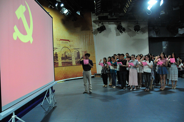 大会伊始,庄严的《国歌》便将整个活动带入到了严肃的氛围中。在凤凰传媒学院副院长陈龙教授的带领下,2013年下半年至2014年上半年新发展的34名党员举起右拳,面对党旗庄严宣誓。新党员们用慷慨激昂的宣誓声向党传达了自己对党的敬意与“全心全意为人民服务”的坚定信念。