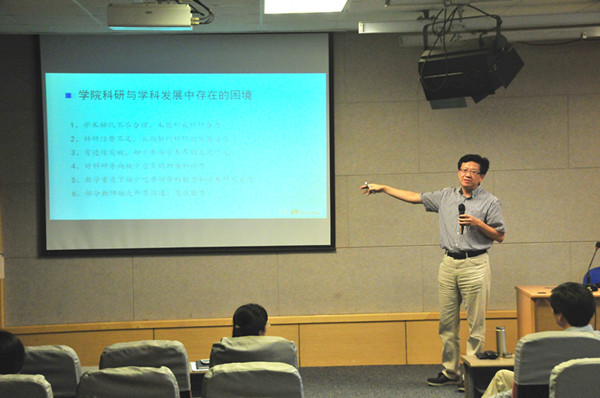 会上,田晓明副校长首先作了题为《纠结与体悟——一位学术管理者、学者的心声》的报告,他分别从“科研地位”、“科研评价”、“科研素养”三方面谈到了自己对高校科研工作的认识、理解和体悟。田晓明副校长强调,所谓“科研”就是金石为开的执著来打开客观事物的缺口,这是科研工作的抓手和突破口,揭示事物的本质。大学里的“研究”,科研居于关键地位,扎实有效的科研工作,是人才培养、学科建设、社会服务的坚强支撑;作为“传道、授业、解惑”者的大学教师必须是研究员,但也不仅是研究员,要求还要更高。关于科研评价,田校长认为,这必须由同行专家担当,大学章程正在起草当中,将还学术权力于学者,现存评价体系是一个路径,但不是目标,任何一个考评体系都有不可消除的系统误差,而“例外原则”可以有效弥补这些偏差。在谈到对“科研素养”的体悟时,田校长分别用了敬畏学术、目标清晰、注重积累、懂得放弃、尊重规则、体验成功、常回头看、学会分享和有点文化来概括了学者应有的素养。田校长在报告的最后指出,未来事业发展的希望在年轻人,希望我院的年轻教师能有所担当,为今后的科研工作发展贡献一份力量。