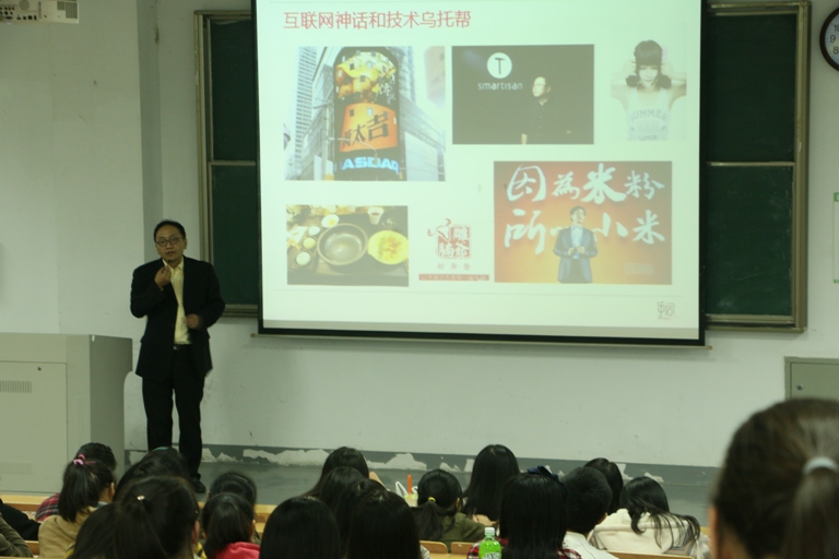 谈及网络广告时,唐问先生指出,网络广告不仅仅是学传播,还要研究消费者和市场。而广告人常常用滥了“营销”这个词,现在流行的“微信”就是一个很好的例子。“微信只是为用户提供了一个广告页面,商家就称之为营销。而真正成熟的营销应该包括产品设计、市场调研、市场宣传、营销等步骤,这样才能打造真正的中国高端品牌。”同时,唐先生又提出了一个非常新颖的话题:互联网神话和技术乌托邦。他以“雕爷牛腩”和“黄太吉”这两个过度包装的产品为例,为我们揭开了“技术乌托邦”的面纱——现在的商家大多是抓住新奇事物,只顾先推销出去,狠赚一笔,而将企业生存的长短置之脑后,致使企业经营难以可持续发展。