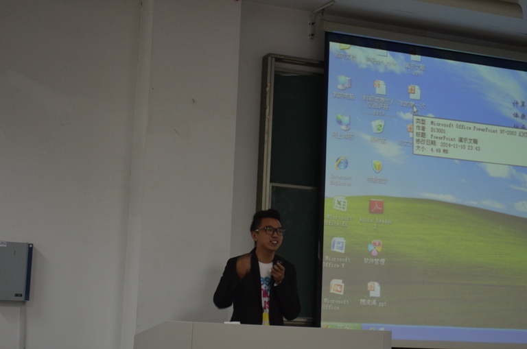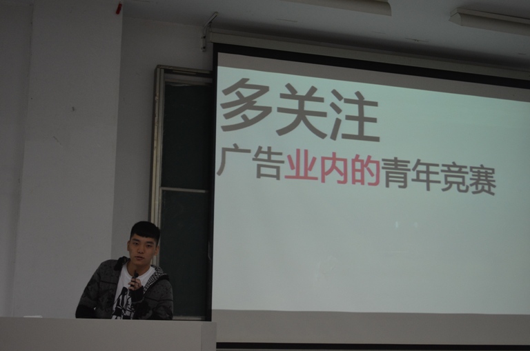 12级学生代表丁溢为新生们分享了参与科研竞赛的经验,他主要讲述了自己第一次接触科研竞赛到第一次参加、再到第一次自主参与竞赛的经历。从对科研赛事的陌生到自己带领团队、独立自主地参与赛事,让大一新生们了解到丁溢同学在科研道路上一点一滴的成长,也增进了他们对参加科研赛事的兴趣和热情。期间,丁溢还放映了自己参与制作的广告视频,其中不乏大家熟知的品牌。比如999感冒灵的广告视频,经过丁溢团队的另一番演绎,给新生们带来了新的广告感受,同时也让他们感觉到广告并非遥不可及,只要有心,今后自己也能组织团队制作出一支漂亮的广告。同时,丁溢也谈到,制作广告的过程中总会遇到这样或那样的困难,比如找不到愿意上镜拍广告的人物等,这就需要自己多一些努力——策划调整广告方案、与拍摄人物多交流沟通等。此外,丁溢还与新生们探讨了关于科研竞赛的一些问题,比如:参与科研竞赛难吗?参与科研赛事有用吗?这些问题都是大一新生所关注的。他告诉大家,老师在课堂上教授的内容只是学习的一部分,而参与科研赛事能让自己学会更多的技术,获得更多的经验,提升自己的能力,是很好的一个锻炼机会。在专业方面,参加科研赛事有利于理论联系实际,将所学知识用于实践;在社会实践方面,参加科研赛事有利于提高社会适应能力,增强团队合作精神。其次,参加科研赛事也不是难事,只要有热情、善思考、会合作就可以。因为赛制的要求,大一能参与的科研赛事比较少,所以在大一这个知识能力的储备阶段,他建议新生们多看优秀作品,关注一些有创意的微博,做一些头脑风暴,同