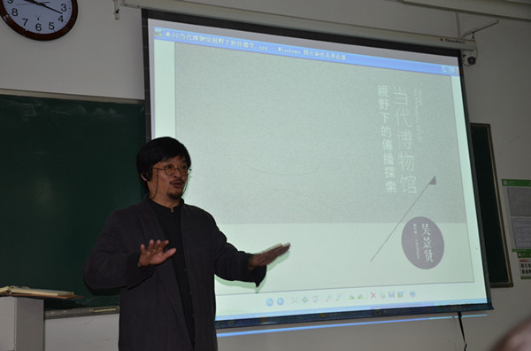 一身飘逸灵动的薄绸唐装,一副带着眼镜绳的金丝框眼镜,一簇精心修剪过的山羊胡。颇有艺术风装扮的吴景贤教授一出场就调动起了会场的气氛,“今天天气很冷,我穿的很少,为了这个讲座,我可是要了风度不要温度。”12月5日早9点,吴景贤教授在苏州大学独墅湖校区文综楼带来一场名为“当代博物馆中的传播学”的精彩讲座。