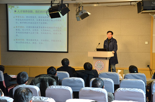 随后,学院陈龙院长做了题为“适应市场需求,坚持质量导向,积极探索创新人才培养思路”的报告。陈龙院长从市场对人才的需求方面切入,结合各层次传媒院校的培养目标,明确了我院的人才培养方向,总结了在课程改革中迫切需要改进的地方。陈院长在讲话中特别提到了要改变现在学院中存在的一些学生成绩很优秀但动手实践能力却十分欠缺的现状,指出了针对传媒类学科的特点、各课程在教学方法和考核方式上所需要做出的调整。陈院长条条精辟的分析和幽默风趣的言辞赢得了在场师生的阵阵掌声。