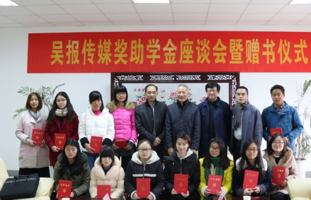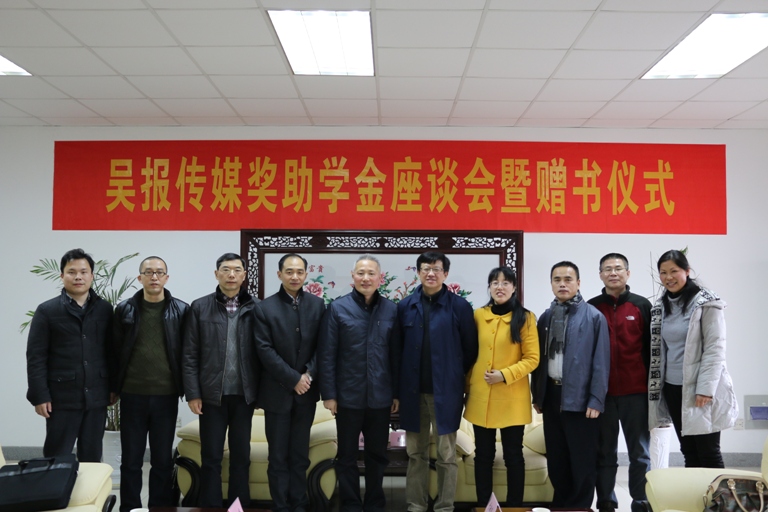 3月11日下午,吴报传媒奖助学金座谈会暨赠书仪式在凤凰传媒学院学术活动中心隆重举行。吴江日报社长徐国平先生、总主编王庆先生、副总编辑杨晓容先生一行,省级研究生工作站吴江市吴风越韵新闻文化信息传播有限公司负责人徐国源教授,校学生处副处长陈平,凤凰传媒学院院长陈龙、党委书记于毓蓝,以及获奖研究生和本科生代表出席了本次座谈会。会议由学院副院长、副书记常青伟主持。
