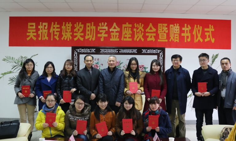 随后,吴江日报领导和学院领导共同为苏州大学2013—2014年度吴报传媒奖助学金获得者颁发荣誉证书并合影留念。吴江日报社苏大研究生工作站获批全省首批人文社科研究生工作站,徐国平被聘为苏州大学硕士研究生导师,吴报传媒奖助学金设立并于2013年颁发了首批奖助学金,作为研究生工作站的研究成果之一——《吴江日报:县区报社在新媒体时代的转型之路》一书,也于吴江日报复刊20周年之际公开出版。该书由我院2015届硕士毕业生钱毓蓓在校外导师徐国平老师、校内导师徐国源教授的共同指导下完成,吴江日报领导和徐国源教授向学院和获奖的同学们赠送了《吴江日报:县区报社在新媒体时代的转型之路》一书。