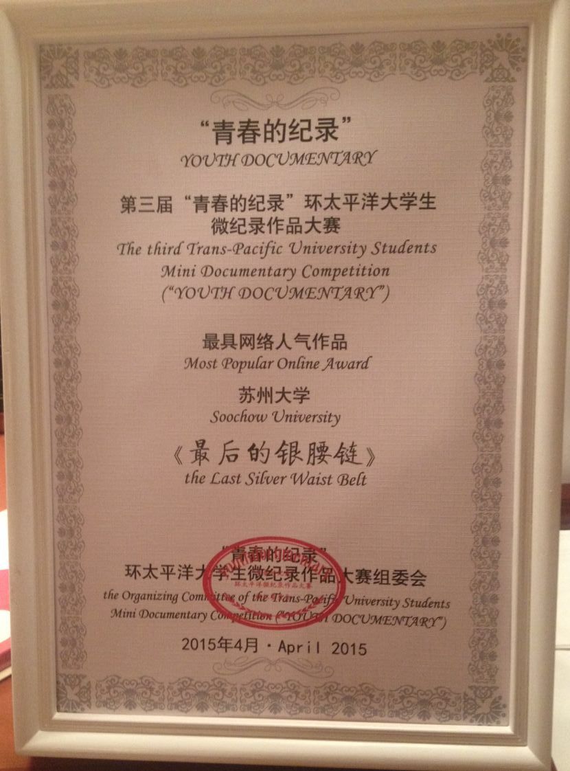 4月18日,作为今年北京国际电影节纪录单元活动之一,第四届“青春的纪录” 环太平洋大学生微纪录作品大赛启动仪式暨第三届获奖作品颁奖仪式在北京电视台举行。在活动中,我院2012级郭星星同学执导的《最后的银腰链》一片获得“最具网络人气”大奖,该作品由杜志红、冯洋老师指导。