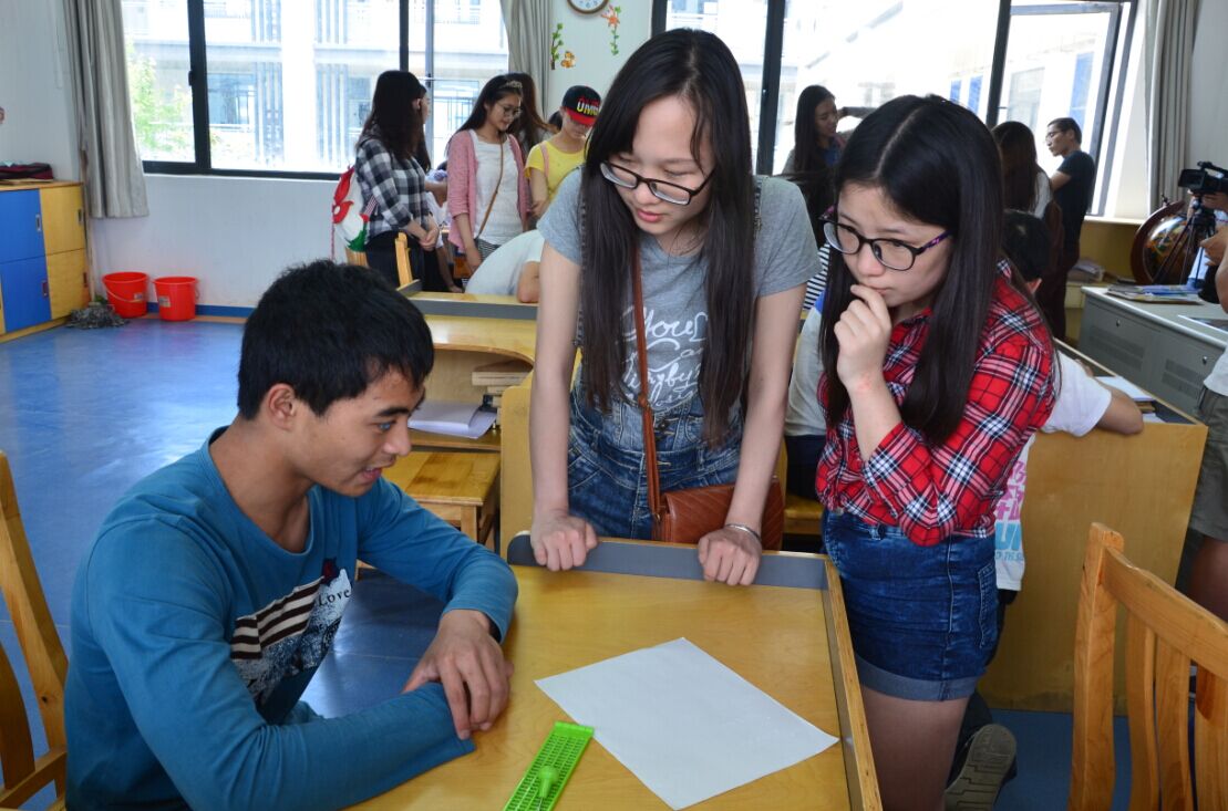 随后,一行人来到盲八班(等同于初二),与孩子们一起交流。他们热情地给到来的哥哥姐姐们用盲文写名字,分享他们的梦想,同时,也对哥哥姐姐们的生活和学习有着很大的好奇。交流过后,党支部的同学为孩子们播放了事先录制好的“美丽中国”的音频。2014级播音主持班的王佳珍用声音带他们来到了西藏拉萨,看到了嵯峨恢宏的布达拉宫,孩子们都沉浸其中。2013级播音与主持艺术班孙越和金梦为大家带来了一堂生动的发声课。“手放在小腹上,想象着面前有一朵花,深吸一口气,去闻花香”这是他们在尝试口播操,尽管不够专业到位,但久久不停的发声,看的出他们的努力和认真,两位见习老师也走下来,耐心地为每一位同学单独辅导。发声练习初见成效后,大家一起学着朗读艾青的《我爱这土地》。“……为什么我的眼里常含着泪水? 因为我对这土地爱得深沉……”,孩子们在老师的一步步引导下,慢慢学会将自己的情感融入进诗中,融进自己动人的声音中。