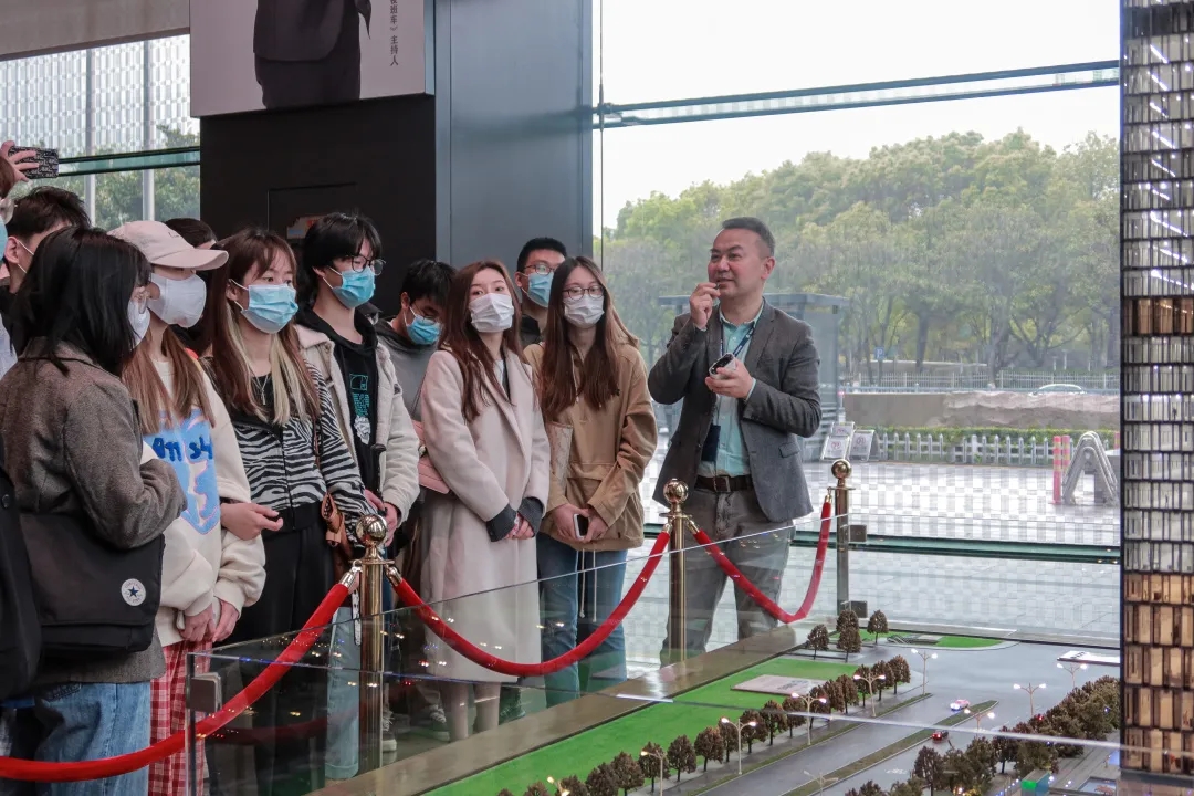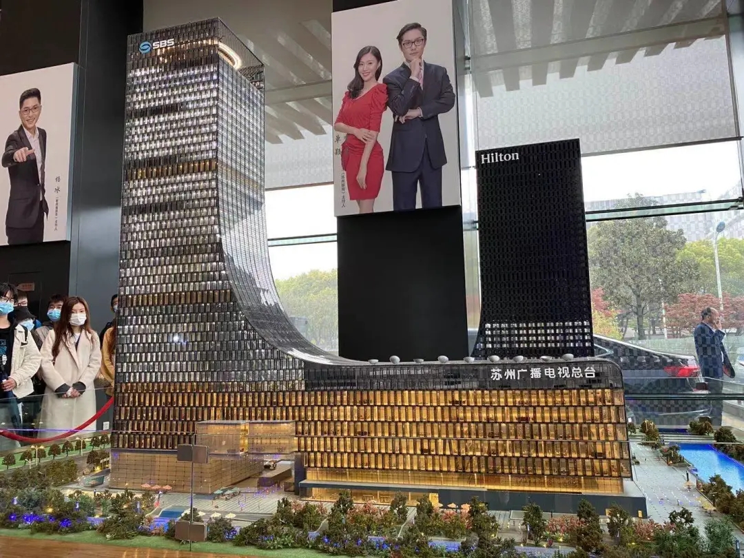 苏州广电总台张俊老师为本次实践活动进行导览和专业讲解。他从大楼模型展示入手,带领大家了解了现代传媒广场和其主要建筑“ 靴子楼 ”的大体布局及设计理念。