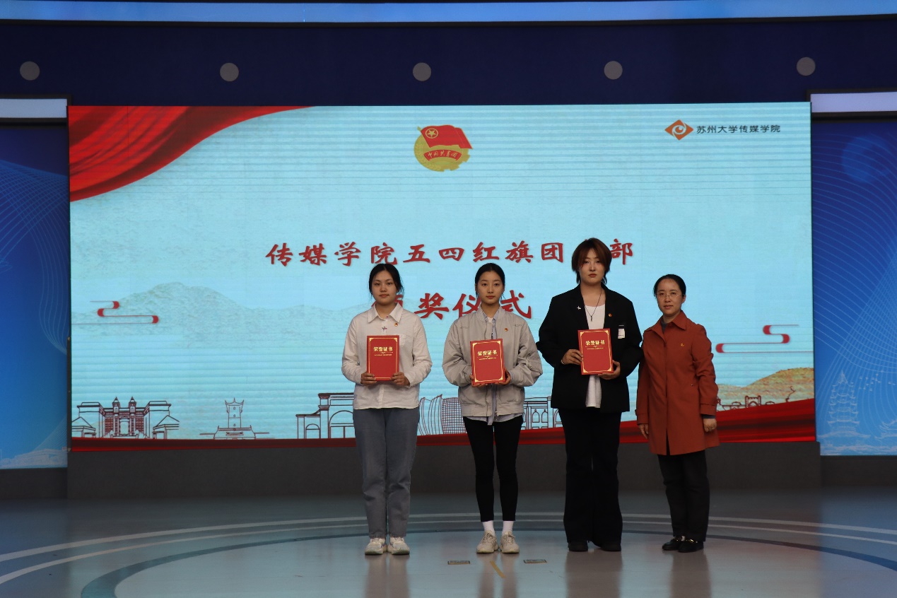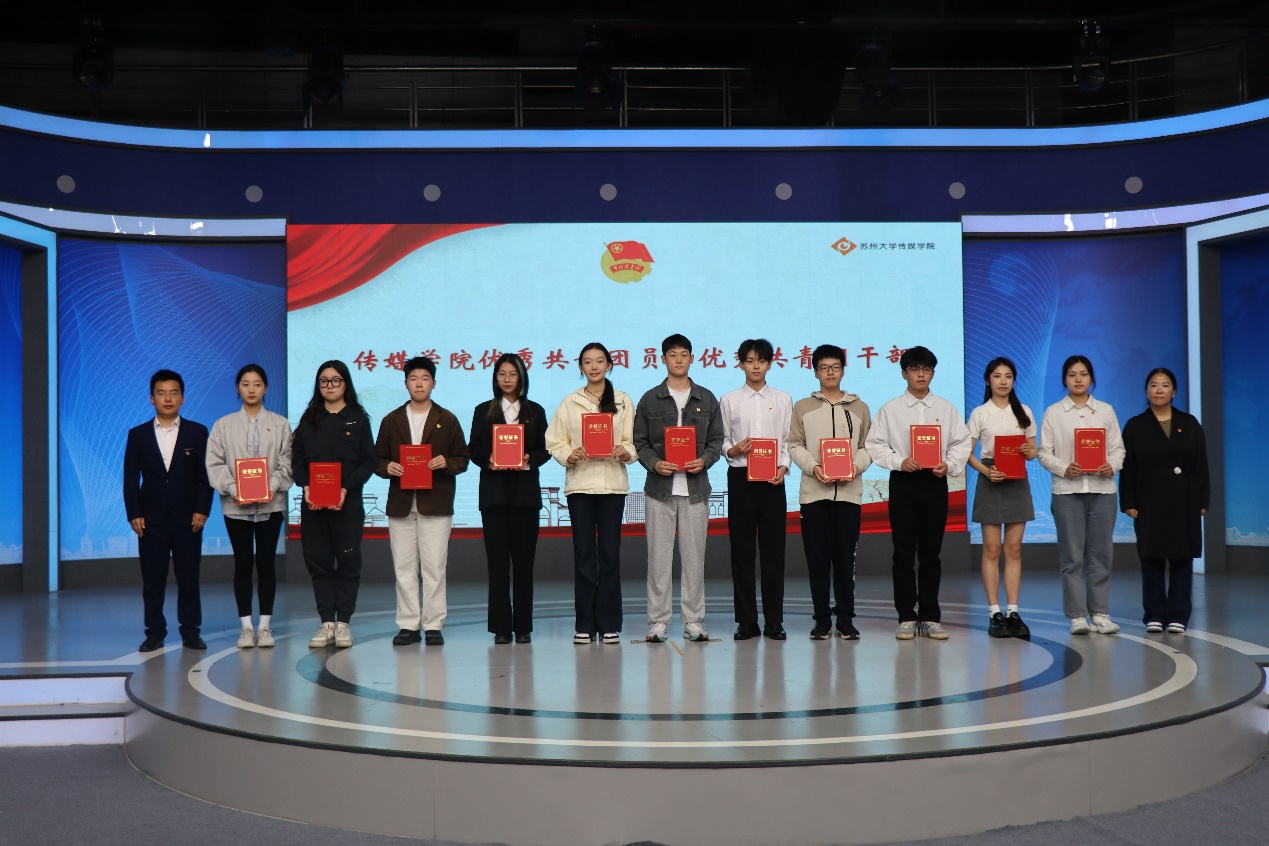 活动在庄严的国歌奏唱声中拉开帷幕。首先,王雁冰宣读《2023年度传媒学院优秀共青团员、优秀共青团干部(含团支部书记专项)、五四红旗团支部的表彰决定》,王雁冰、宋智、丁姗分别为获奖代表和集体颁奖并合影留念。