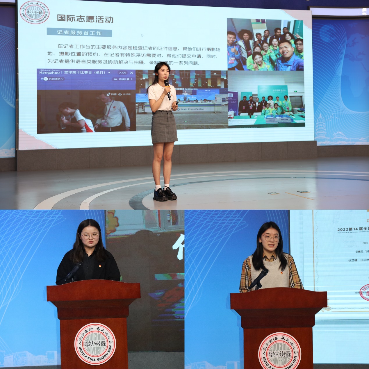 在五四特别团日活动暨信仰公开课环节中,苏州大学五四青年奖获得者王一然同学从“初心缘起”“追梦足迹”“初心闪光·爱达未来”三个方面,讲述了自己的校内外志愿服务经历与感悟,激励同学们不忘初心、砥砺前行,以一技之长发光发热,为社会做些有意义的事情。苏州大学五四青年奖·向上向善好青年获得者郑雾同学以“星光不负有心人”为题,从传承者、讲述者、奋斗者三个方面分享了自身的学生工作故事及在学术、团务工作中的体会,鼓励同学们把握机会、敢于作为,为实现个人价值和社会进步贡献青春力量,找到属于自己的那片星光。国家奖学金获得者徐芷檬同学以“致广大而尽精微 积小流以成江海”为题,讲述了自己“以赛促学”的学术科研和学科竞赛经历。她鼓励同学们发挥自身特长优势,专注提升自我能力,在机遇与挑战并存的当下坚定理想、追逐梦想,在矢志奋斗中谱写新时代的青春之歌,成为闪闪发光的青年。