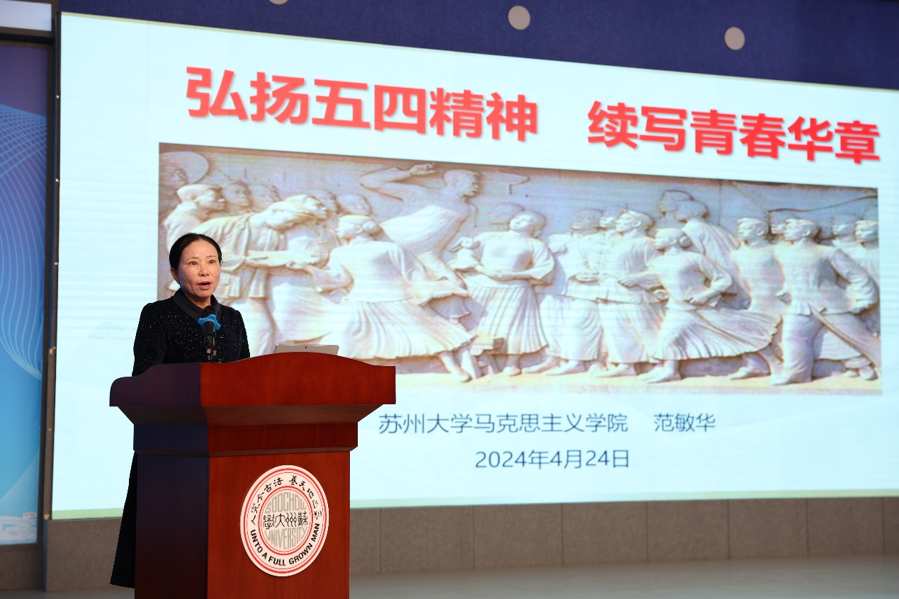 最后,范敏华老师以“弘扬五四精神 续写青春华章”为题,为同学们上了一堂别开生面的信仰公开课。她从“那年的五四”“那时的青年”“今天的我们”三个方面深情阐释了五四运动的历史及其重大意义、五四精神的内涵和新时代青年应该如何弘扬五四精神。正如习近平在纪念五四运动100周年大会上的讲话中指出,五四运动以全民族的力量高举起爱国主义的伟大旗帜,以全民族的行动激发了追求真理、追求进步的伟大觉醒,以全民族的搏击培育了永久奋斗的伟大传统。她分享了五四青年们的感人故事,呼吁同学们要以在救国救民、民族复兴的伟大征程中涌现的青年英雄为榜样,继承和弘扬五四精神,树立远大理想、热爱伟大祖国、担负时代责任、勇于砥砺奋斗、练就过硬本领、锤炼品德修为,坚定不移听党话、跟党走,努力成长为堪当民族复兴重任的时代新人。