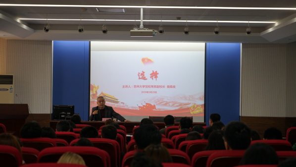 苏州大学党校常务副校长戴佩良向参训学员作了题为《选择》的主题培训报告。戴校长首先向大家讲述了党和国家对人才选择的变化:现在需要能随着时代持续进步、全面发展的人才,作为当代大学生,要做到精神抖擞,要表现出阳光向上的正能量。戴校长强调:“人生不过百年,这才是人生应该具有的状态。”戴校长还带领大家回顾了党的奋斗历程,向学员们强调了党组织发展的艰辛。他以深厚的历史学功底,向学员们阐述了中国共产党是经过战争锻炼的政党,更是人民选择的政党,正是因为民众的支持,中国共产党才能有今天的发展。尤其是如今在习近平新时代中国特色社会主义思想的指引下,中国共产党已经把中国建设成了一个值得我们自豪的国家,我们将在社会主义的道路上越走越宽、越走越远、越走越好。最后,戴校长从倡导团结友爱共同进步、弘扬中华优秀传统文化、坚定民族气节等方面向参训学员提出了具体的要求。