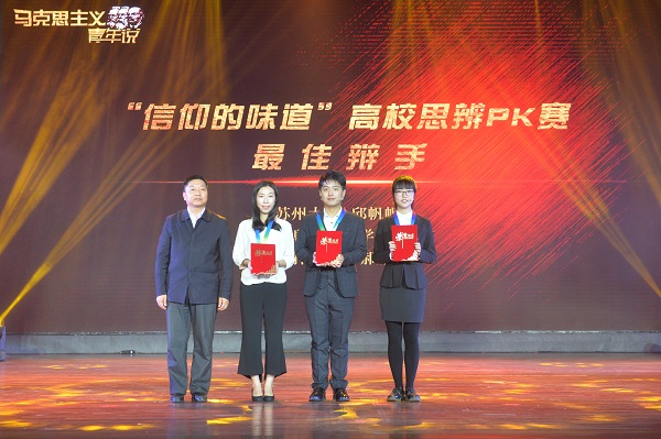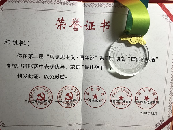 2018年12月25日,由中共江苏省委宣传部、中共江苏省委省级机关工委、江苏省教育厅、共青团江苏省委主办,新华报业传媒集团承办,东南大学协办的第二届马克思主义·青年说闭幕式暨东南大学专场在东南大学顺利举行,省委常委、宣传部部长王燕文,东南大学党委书记左惟等领导出席活动。苏州大学思辨战队荣获马克思主义·青年说辩论比赛冠军,其中,传媒学院17级广告学邱帆帆同学获得全程最佳辩手,作为代表进行了名为《马克思是对的》现场主题演讲。
