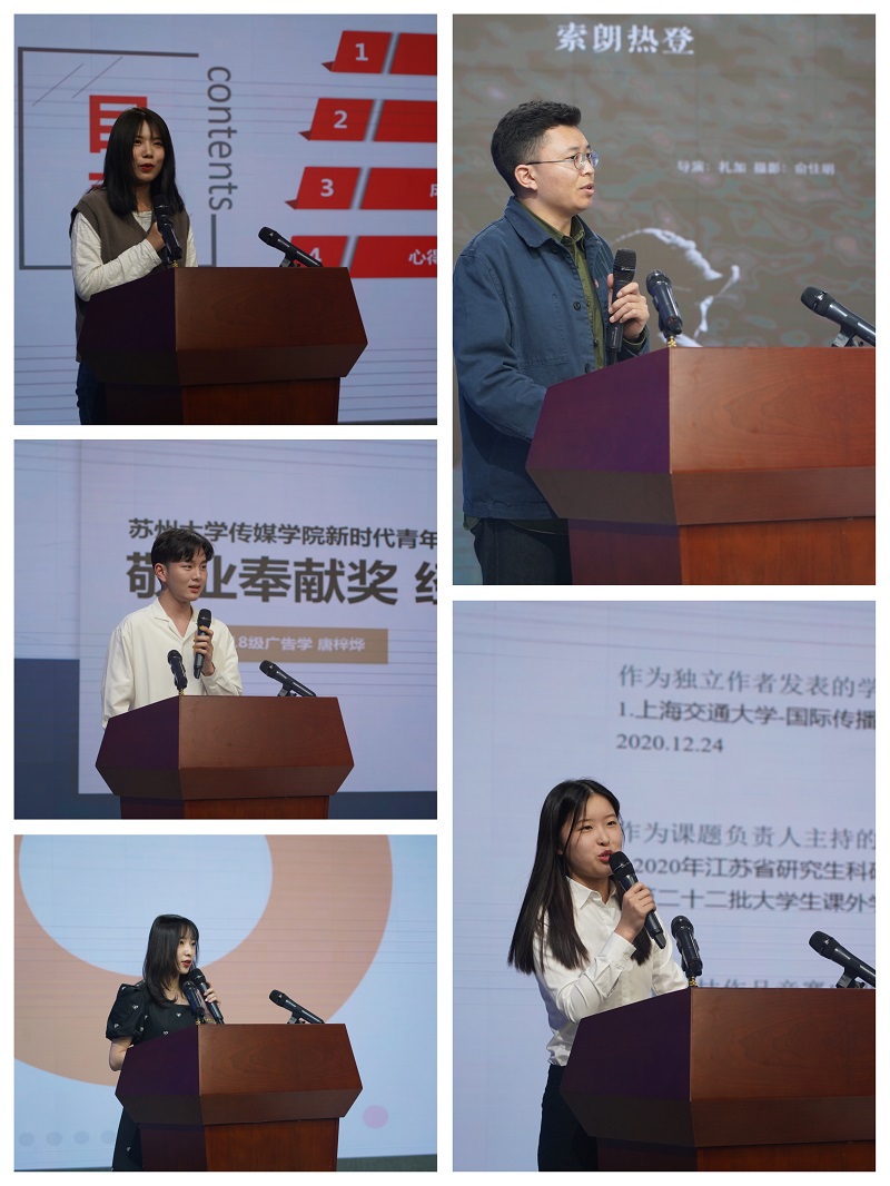 表彰环节后,获奖代表依次为同学们上了一场信仰公开课,分享各自的榜样事迹。“勤勉自强奖”获奖代表扎加同学分享了自己的影片《索朗热登》的创作故事;“敬业奉献奖”获奖代表唐梓烨同学讲述了自己在工作岗位上默默耕耘、永葆真诚的心路历程;“创新创业奖”获奖代表李超同学分享了做有灵魂的学术研究心得,并从项目申请、问题意识、学术规范等方面提出了建议;“文明风尚奖”获奖代表陈欣仪同学通过她丰富多彩的志愿和文体活动经历,展示了“唯有热爱,无畏世间无常”的青春力量;优秀共青团干部代表池铭晰同学分享了她在担任2019级新闻传播学类1团支部团支书期间带领团支部创先争优,取得了累累硕果的经验。