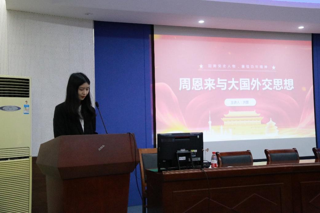 其次,本次微党课视频比赛二等奖获得者洪图同学为大家带来了《周恩来与大国外交思想》主题演讲。她从人物介绍、外交实践、外交魅力、时代价值四个方面展开,介绍了周恩来总理及其外交智慧。让同学们对周恩来总理杰出的外交能力及其对我国外交事业的贡献有了更深刻的了解。在她演讲结束后,主持人还分享了自己的心得体会,并启发同学们做“心怀使命与担当”的新传学子,思考如何做好对外传播、建立正面积极的国家形象。