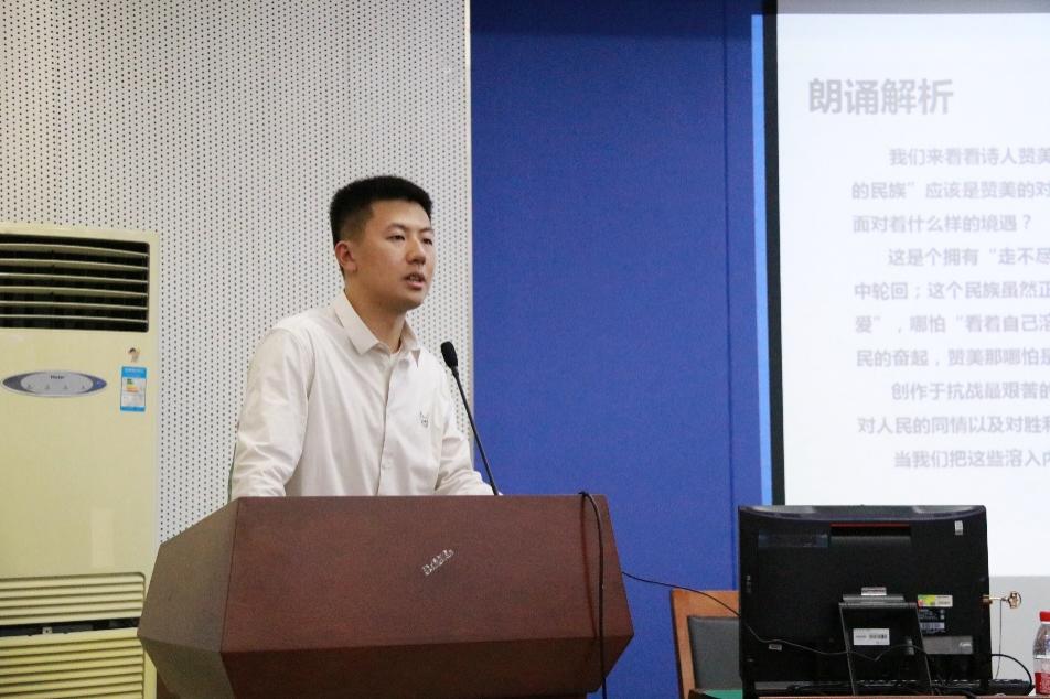 首先,本次微党课视频比赛一等奖获得者姚凯迪同学为大家带来了《穆旦与苦难民族的精神赞歌》主题演讲。他介绍了穆旦及其作品,播放了相关的诗歌朗诵视频,用纯正的播音腔为大家带来了一场难忘的听觉盛宴。他以“朗诵再现”的方式让穆旦这位历史人物从尘封的党史中鲜活起来,让我们感受到了民族崛起的希望。不仅如此,姚凯迪同学还分享了他宝贵的朗诵技巧,并且提示大家日后可以学会用“情景再现”的方式去思考问题。