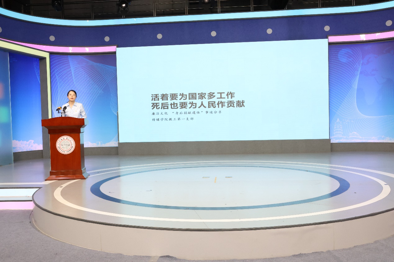 “活着要为国家多工作、死后也要为人民做贡献”,教工第一党支部的焦文将苏大退休教授杨汝杰等同志“身后捐献遗体”的崇高事迹娓娓道来。她声情并茂地讴歌了他们的无私奉献,并表示,与他们所捐出的物质相比,这份精神更是无价之宝。大爱无言,奉献无声,她呼吁在场观众用最真挚的感情,深切的缅怀,向崇高的捐献者致以崇高的敬意。