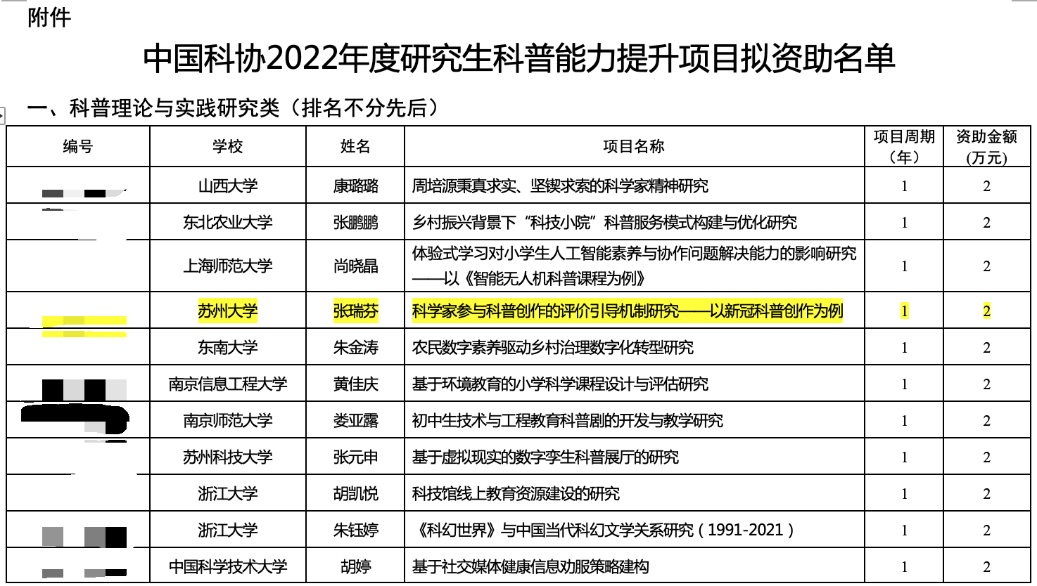 9月28日,中国科协科普部公布了2022年度研究生科普能力提升项目的评审结果,在导师贾鹤鹏教授的指导下,我院2020级研究生张瑞芬主持申报的“科学家参与科普创作的评价引导机制研究”课题被批准立项,资助金额为2万元。这是自中国科协启动研究生科普能力提升项目以来,我校研究生获得的首个该项目立项。