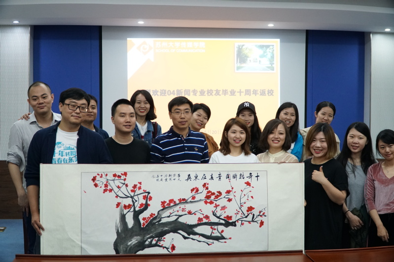 参观结束后,校友们齐聚5148报告厅,夏书记向远道而来的校友们表示欢迎,对校友们长期以来支持母校发展表示了真挚的感谢,并向校友们介绍了十年来学院的改革发展情况。返校校友们向学院赠送了他们每个人都参与创作的水墨画作《十年转瞬间,青春在东吴》,借此表达对青年年华的美好回忆,对母校、恩师的无限感恩和对学校、学院蒸蒸日上的祝福与期盼。