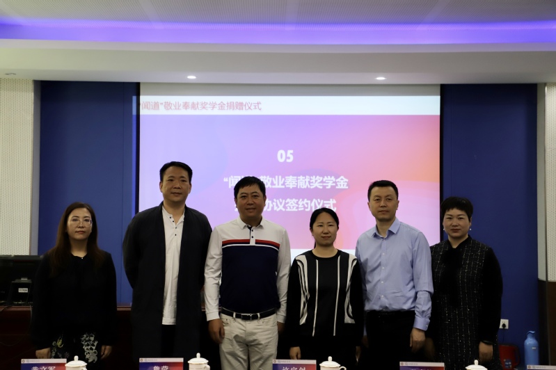为支持苏州大学教育事业发展,密切传媒学院与苏州闻道网络科技股份有限公司的联系,加强双方在人才培养、科学研究、技术开发等方面的合作,鼓励在校学生勤奋学习,刻苦钻研,全面发展,5月21日下午,“闻道”敬业奉献奖学金捐赠仪式在传媒学院5148室隆重举行。