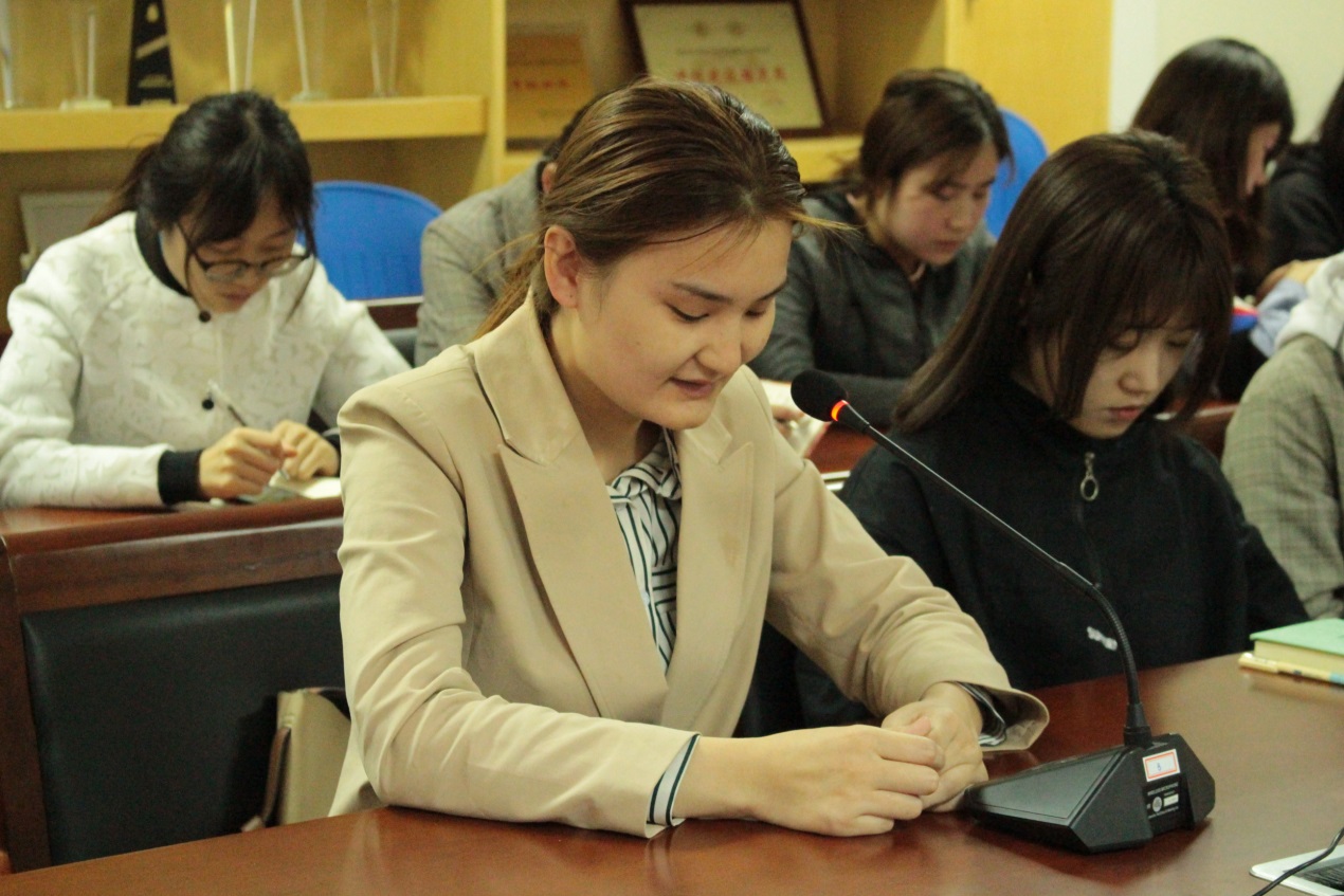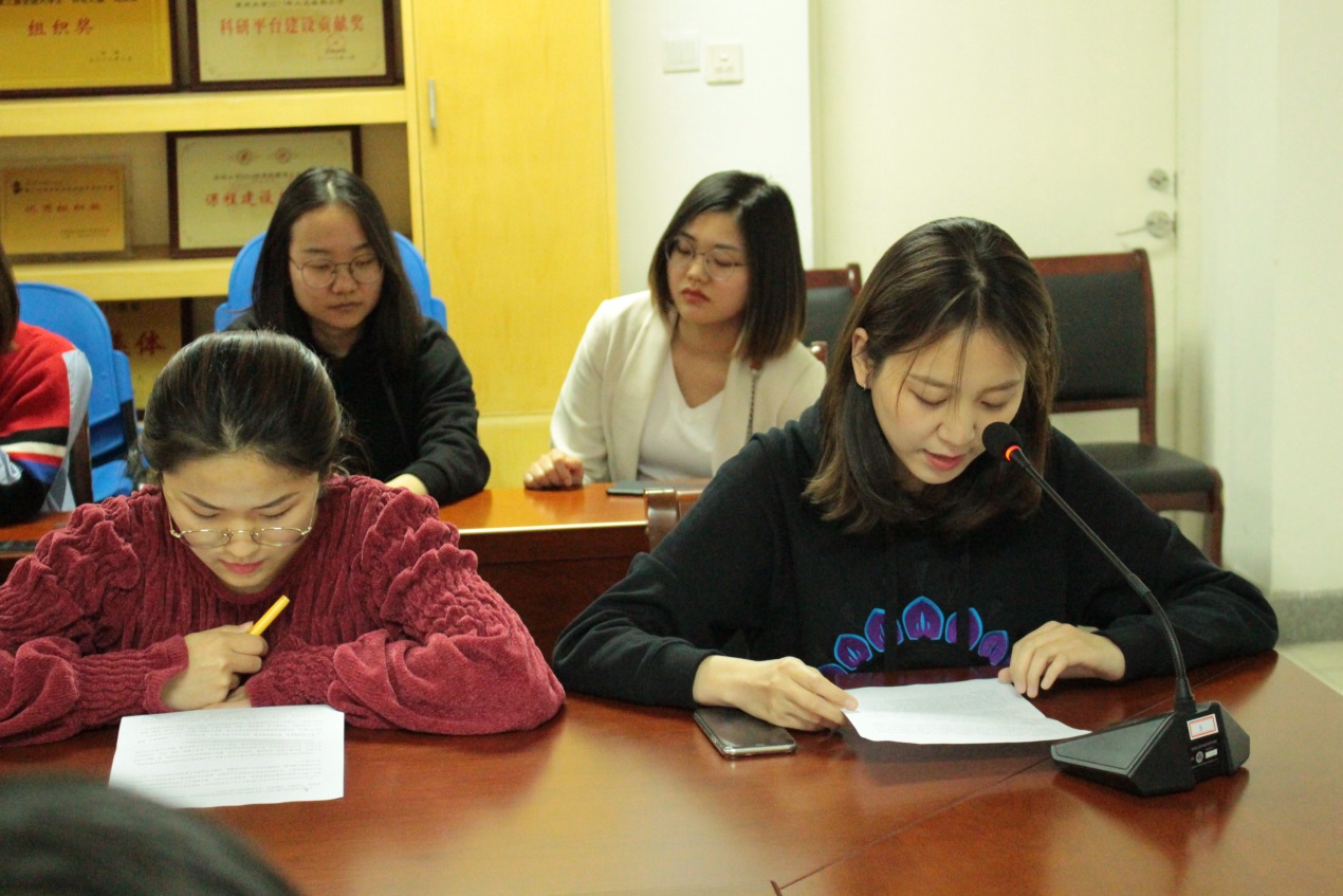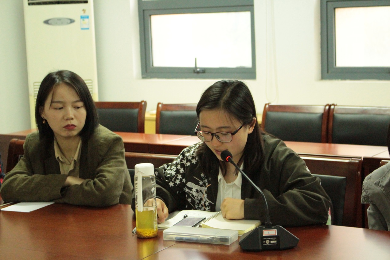 学硕入党积极分子谷文娇同学则将五四精神与弘扬时代精神联系在一起。她提到,五四运动留给我们最宝贵的精神财富就是以爱国、进步、民主、科学为主要内容的伟大精神。“作为当代青年,面对新的形势和任务、面对新的机遇和挑战,我们一定要勇立潮头,开风气之先,奋发进取创时代之伟业,为建设更好地社会做出青年应有的贡献。”