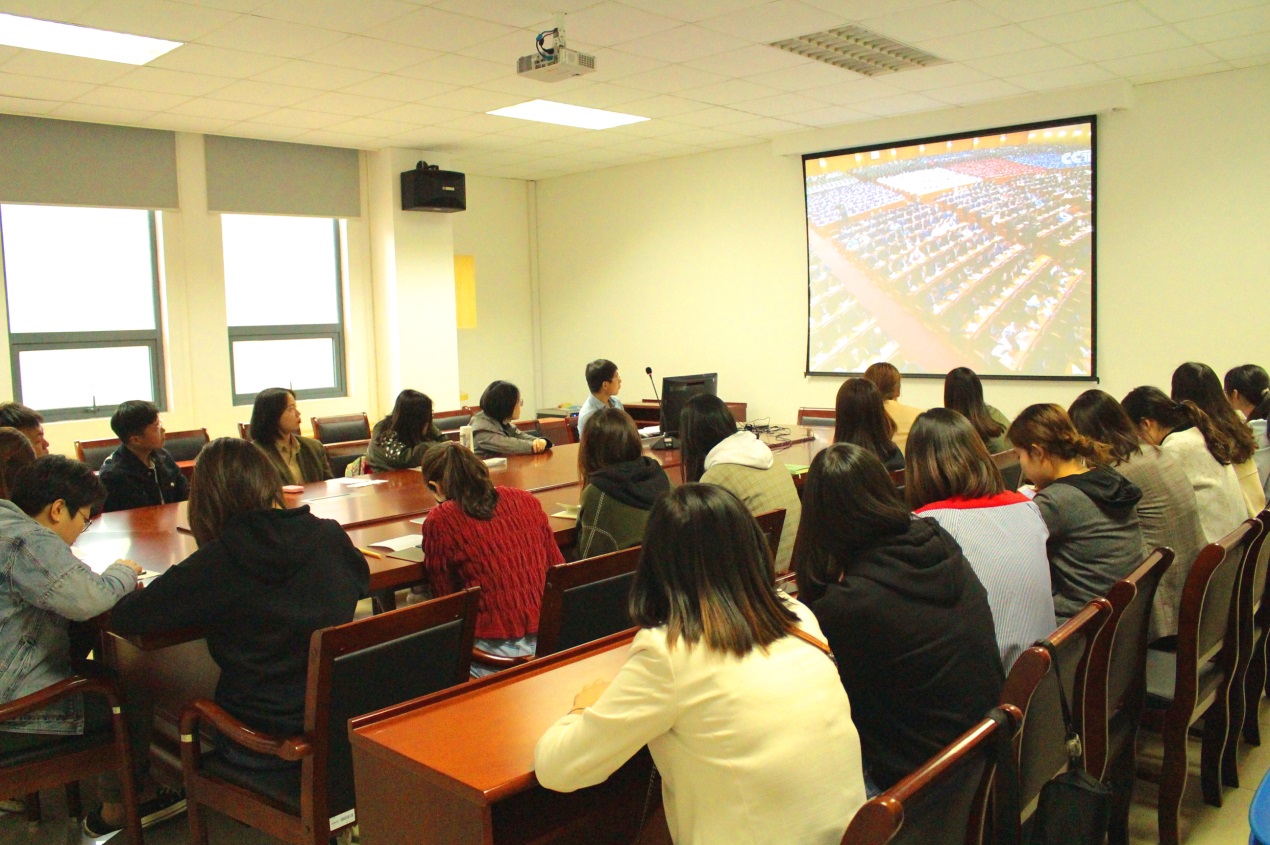 座谈会上,同学们集体观看了纪念五四运动100周年大会视频,并认真学习习近平总书记在大会上的讲话内容。针对习近平总书记在大会上对新时代青年做出的几点要求,参会人员积极发言讨论。
