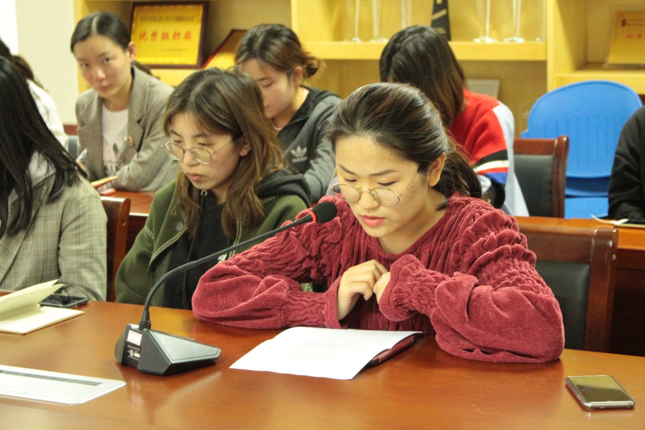 团支部代表张云同学将五四精神与日常工作相结合,她提到“作为基层青年团干部,在今后的基层团支部工作中我们要夯实好基础建设,发挥好团的政治引领作用,带领支部团员在担当中历练,在历练中成长。”最后张云同学也希望大家都能身体力行,实现习近平总书记对当代青年提出的六点要求。