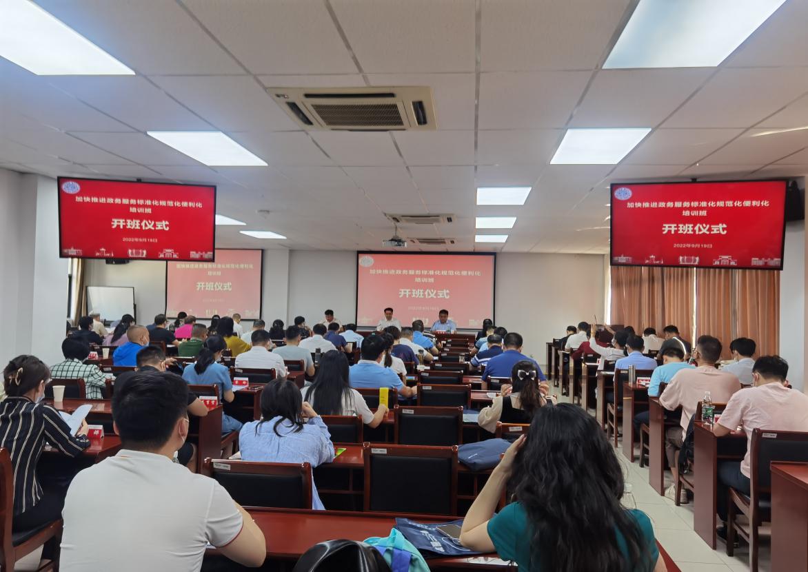 2022年9月19日上午,加快推进政务服务标准化规范化便利化培训班开班仪式在我校培训中心205教室举行。广西壮族自治区大数据发展局党组成员、副局长韦江同志,苏州大学继续教育学院副院长王建凯同志出席本次开班仪式并分别讲话,广西壮族自治区大数据发展局政务管理与协调处处长庞进同志主持。参加本次开班仪式的还有区直、中直各单位窗口首席代表和业务骨干,各设区市政务服务监督管理部门、自贸区各片区政务服务监督管理部门负责人等约80余人。