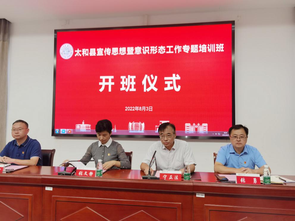 2022年8月3日上午,太和县宣传思想暨意识形态工作专题培训班开班仪式在我校培训中心105教室举行。中共太和县委常委、宣传部部长张文静、冠军体育下载党委书记宁正法、中共太和县委纪委副书记、监委副主任阮传宇、新华社中国经济信息社安徽分中心总监张勇出席开班仪式并分别讲话,中共太和县委宣传部副部长、网信办主任闫永世主持,太和县宣传系统领导干部等共60余名学员参加本次开班仪式。