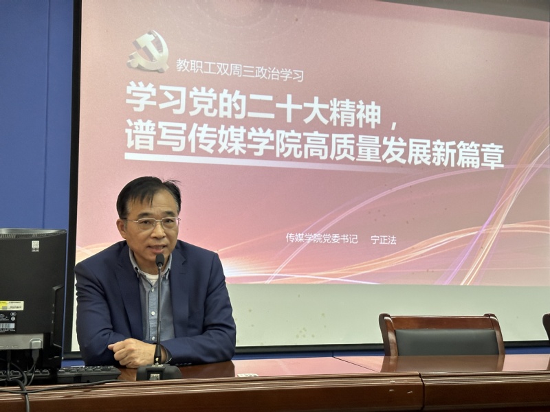 在双周三政治学习会上,宁正法作了题为《学习党的二十大精神, 谱写传媒学院高质量发展新篇章》的报告。宁正法全面、系统、深入地解读了党的二十大报告,并结合学院工作实际,重点阐述其中蕴含的理论观点、思想方法和工作要求。宁正法以“五个牢牢把握”和“五个持之以恒”,号召全院教师以党的二十大精神为指引,落实立德树人根本任务,用实际行动谱写学院事业高质量发展新篇章。