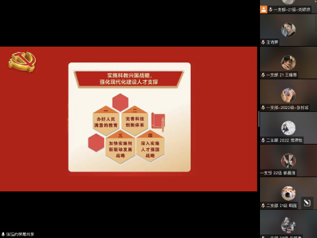 为进一步加强学习,10月16日,支部开展以“学习党的二十大 砥砺奋进新征程”为主题的学习研讨活动,在活动中,张猛同志带头领学。他围绕“伟大变革、历史使命、中心任务”等关键词,结合自身的学习工作经历,为支部党员上了一堂生动的理论课,激励支部党员锤炼专业本领,保持踔厉奋发的进取精神。受到党的二十大精神的感召,党员同志们积极发言,分享自己的学习心得。高健同志表示“作为新时代的青年学子,我们更要坚定不移听党话、跟党走,怀抱理想,脚踏实地。”此外,罗茜茜同志也表达了自己的初心,“身为一名青年共产党员,我们要以担当实干的作风,在疫情防控的前线、在扶贫支教的队伍间、在科研攻关最前沿等方面贡献自己的力量。”
