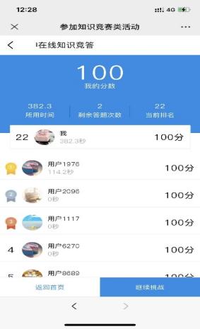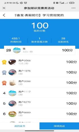 为进一步引导全体党员深刻领会、准确把握党的二十大报告精神,11月2日,支部依托学校图书馆平台,组织开展学习党的二十大精神在线知识竞赛活动,营造“比、学、赶、超”浓厚学习氛围。本次竞赛题目均由中国共产党第二十次全国代表大会相关知识组成,包括大会主题、大会报告、精神指示等内容,试题包括选择题和判断题。在竞赛中,多名党员同志获得100分好成绩,营造出了一场紧张激烈、精彩纷呈的线上知识比拼。此次知识竞赛活动的开展为支部党员贯彻落实党的二十大精神提供了一个良好的平台,增强了支部党员学习的参与性和互动性,在实践中提升了对于理论知识的掌握程度,达到以赛促学、以学促行的目的。