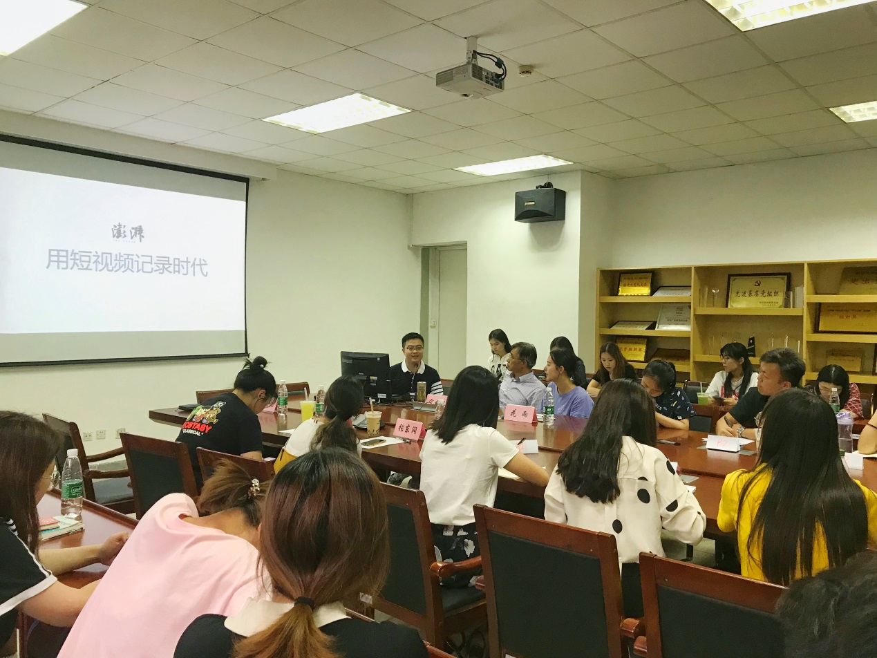 在分享中,张老师表示希望通过此次活动能与同学们交流在就业以及采访过程中的相关问题。他先向同学们介绍了澎湃新闻的整体运作,并分享了澎湃新闻在两会提问的相关经历,尤其对自己所在的视频部进行了详细的解说,他提到“短视频是媒体转型的重要阵地”。